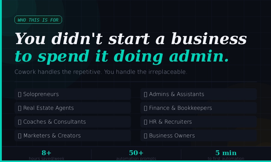 If you spend more than 30 minutes a day on emails, reports, follow-ups, or admin — Cowork can give most of that time back. This program is built for solopreneurs, business owners, assistants, real estate agents, coaches, marketers, and anyone running a business without enough hours in the day.